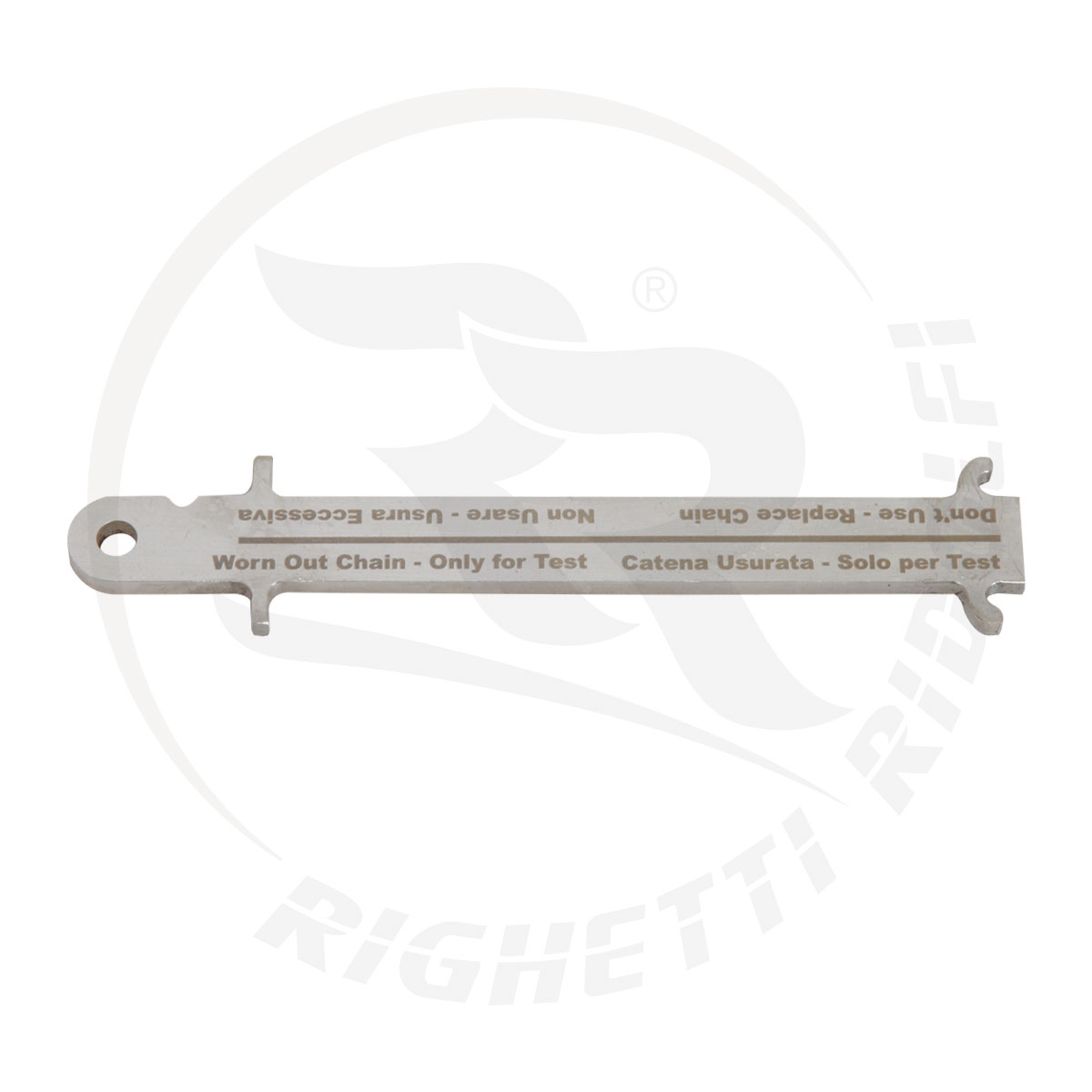 Comprobador desgaste de cadena 219. Para comprobar fácilmente el desgaste de la cadena. Esta herramienta controla el grado de desgaste de la cadena de una manera simple y rápida. Uso simple pero esencial. Una cadena desgastada aumenta exponencialmente el desgaste de la corona y el piñón, además de tener una alta posibilidad de rotura. El medidor tiene dos medidas: - por un lado, se determina cuando no es recomendable usar la cadena en la carrera - por el otro lado, se determina cuando la cadena debe reemplazarse inmediatamente debido a un desgaste excesivo. Si la cadena no entra en el comprobador, el desgaste es aceptable. Referencia: KC570-219